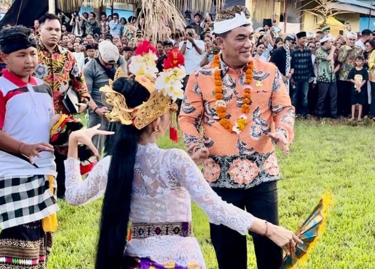 Gubernur Yulius mengungkapkan rasa terhormatnya saat pertama kali dipakaikan udeng, ikat kepala khas Bali, oleh masyarakat.
