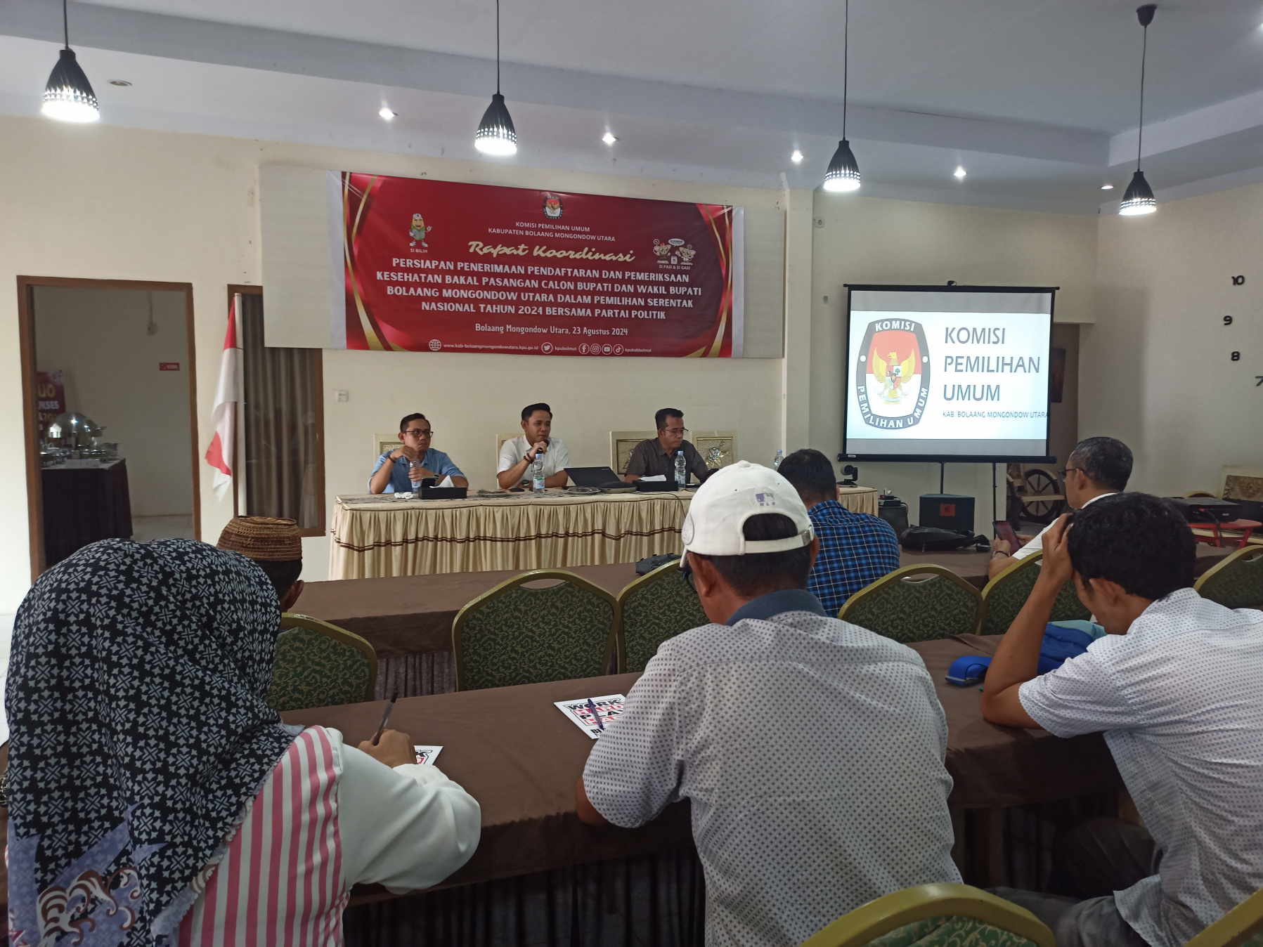 DOTNEWS.ID Bolmut – Dalam rangka persiapan penerimaan pendaftaran dan pemeriksaan kesehatan bakal pasangan calon bupati dan wakil bupati, Komisi Pemilihan Umum (KPU), Kabupaten Bolmong Utara (Bolmut), gelar Rapat Koordinasi (Rakor) bersama para pimpinan Partai Politik, Jumat (23/8/2024).