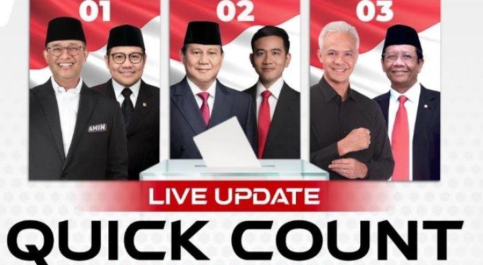 Bedasarkan data sementara hasil hitung cepat lembaga quick count Charta Politika, pasangan Prabowo-Gibran unggul 57,67% dan Anies-Imin 25,88% serta Ganjar-Mahfud 16,46% berdasarkan data yang masuk 67,40%.