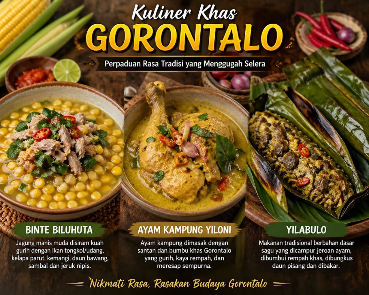 Salah satu yang paling populer adalah binte biluhuta atau milu siram, yakni olahan jagung manis muda yang disajikan dengan kuah gurih, dipadukan dengan ikan tongkol atau udang, kelapa parut, serta aneka rempah dan daun aromatik. Cita rasanya semakin nikmat dengan sambal dan perasan jeruk nipis.