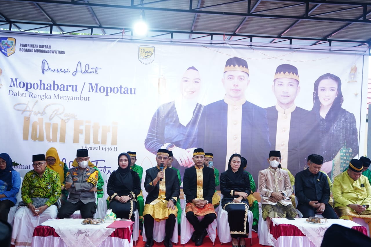 DOTNEWS.ID Bolmut – Menjadi tradisi, Bupati Bolmut Sirajudin Lasena SE MEc Dev bersama Wakil Bupati Mohamad Aditya Pontoh SIP atau disebut Ki Doni Pangulu (Pemimpin, red) menerima Prosesi Adat Mopohabaru/Mopotau, dalam rangka menyambut hari raya Idul Fitri 1446 Hijriah, bertempat di kediaman Bupati Bolmut, Desa Boroko, Kecamatan Kaidipang, Rabu (26/3/2025).