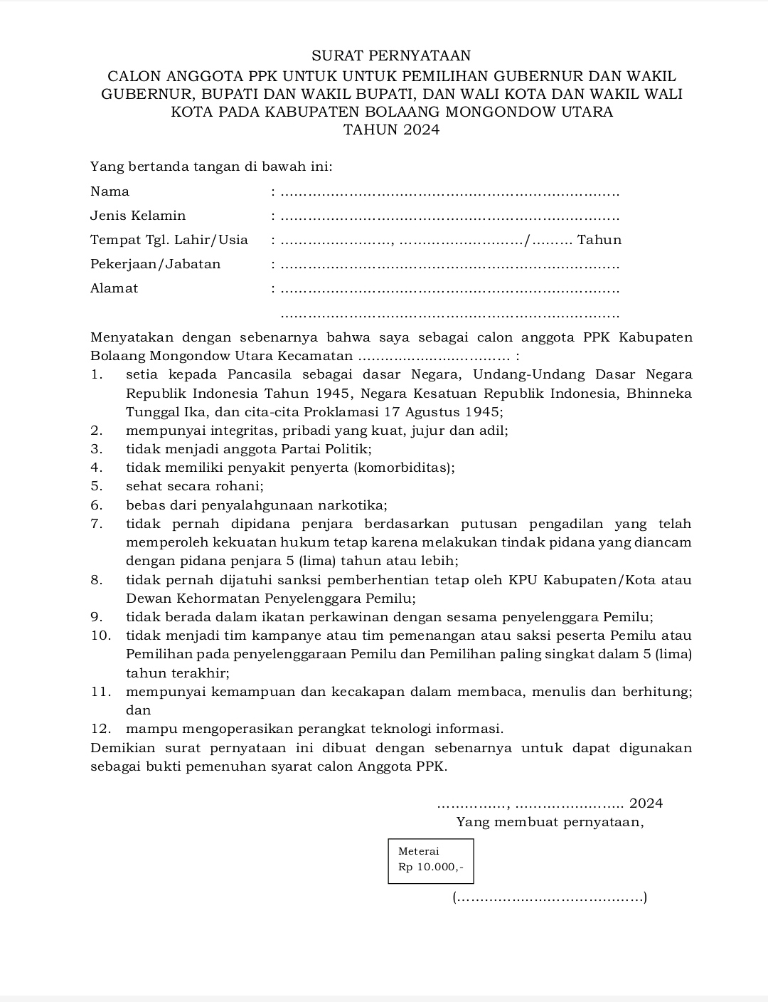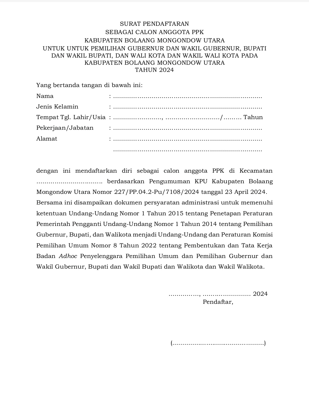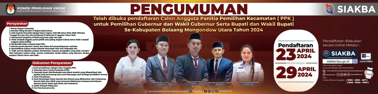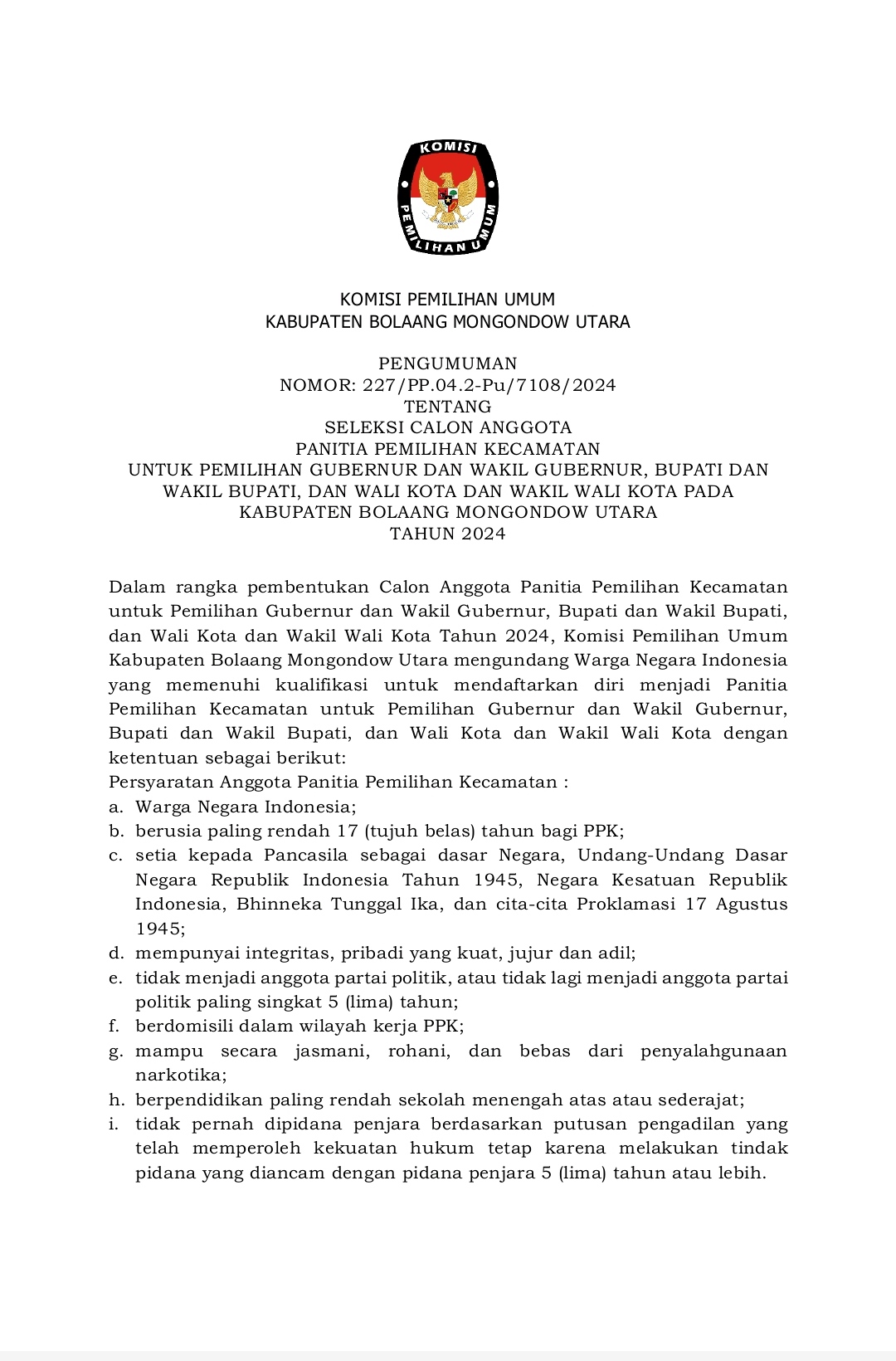 Berikut syarat pengumuman perekrutan PPK Pilkada serentak Kabupaten Bolmut tahun 2024 yang dikeluarkan KPUD Bolmut: