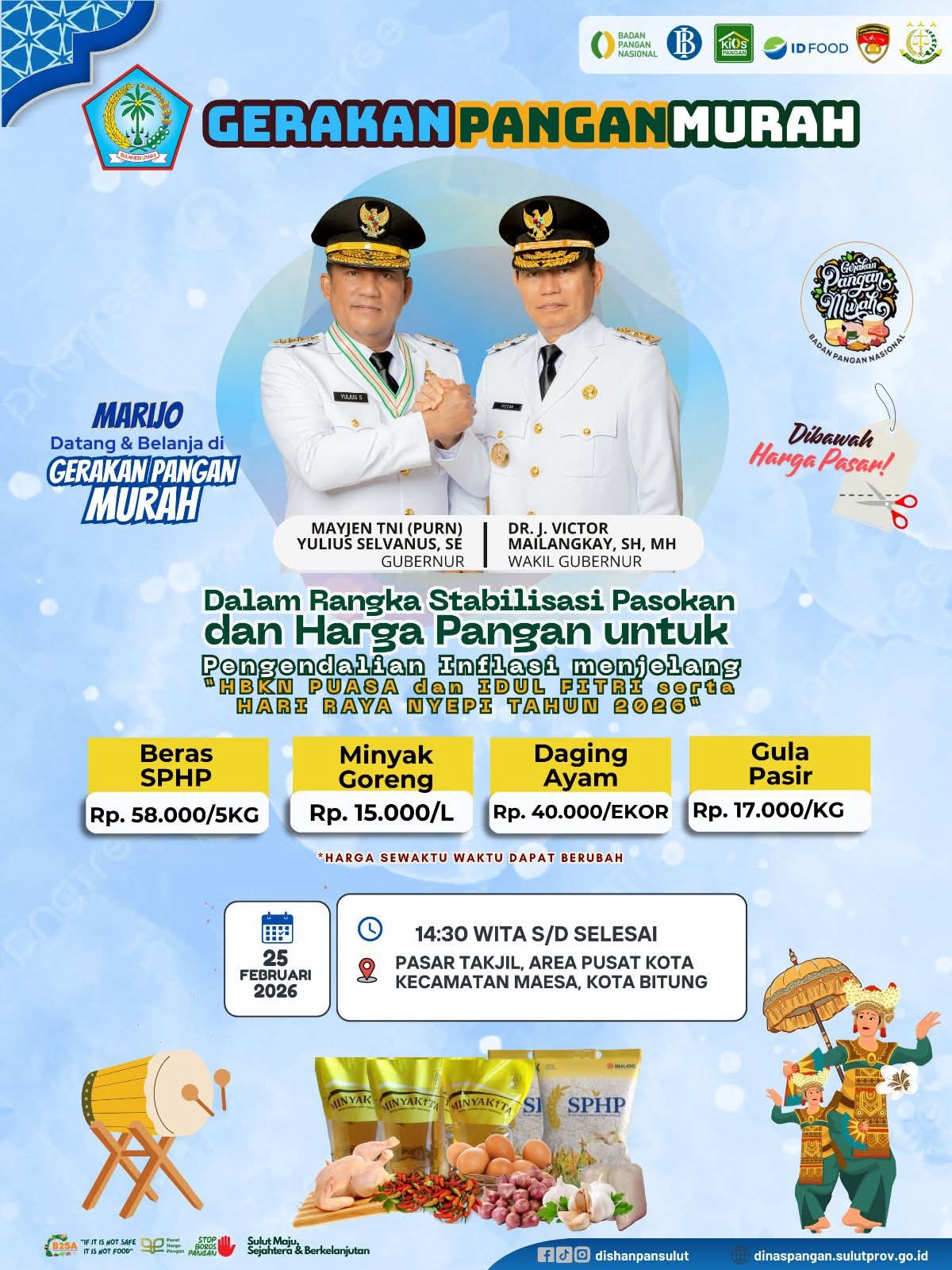 Gerakan Pangan Murah ini juga menjadi bagian dari dukungan terhadap program Pemerintah Provinsi Sulawesi Utara di bawah kepemimpinan Gubernur Yulius Selvanus dan Wakil Gubernur J. Victor Mailangkay, dengan semangat Sulut Maju, Sejahtera, dan Berkelanjutan.