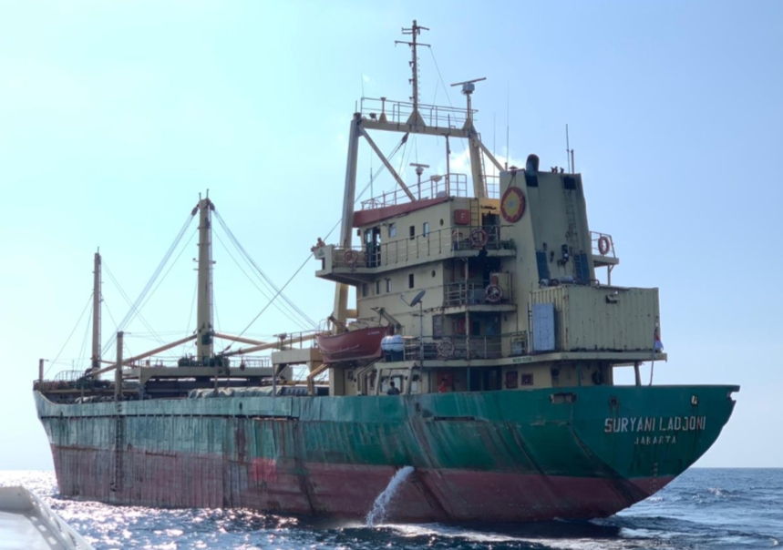 KM Suryani Ladjoni 2.226 GT milik Perusahaan Pelayaran PT Surya Bintang Timur, rute pelayaran Bitung-Bontang membawa dengan membawa 17 ABK, ditangkap pada Rabu (31/7/2024) oleh kapal Patroli HSC 32-03 Bakamla Zona Tengah dalam Patroli Pukat Manguni-IV/24 Tahap III, di titik koordinat 1°54’09.00″ U – 125°02’29.98″ T, Perairan Pulau Talise Sulawesi Utara.