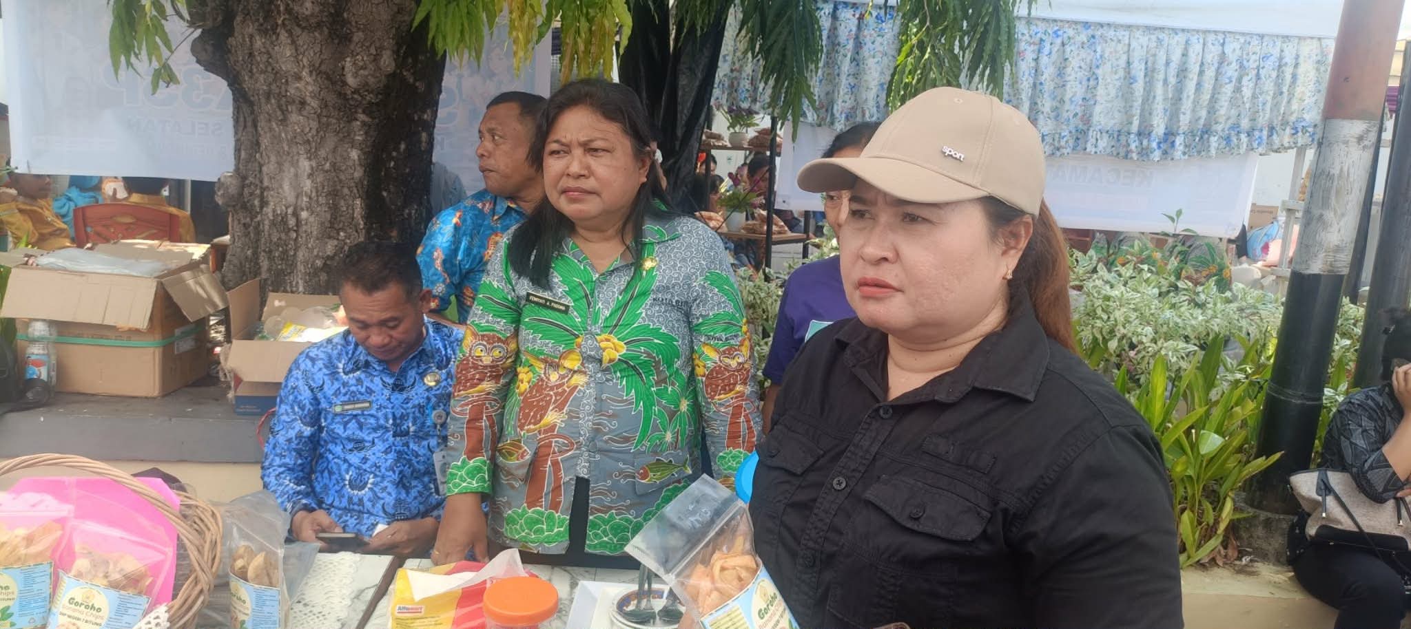 DOTNEWS.ID | BITUNG — Ketua Forum Kewaspadaan Dini Masyarakat (FKDM) Kota Bitung, Olga Banua Dotulong, mengunjungi stand Usaha Mikro Kecil dan Menengah (UMKM) milik siswa-siswi SMP Negeri 7 Bitung, sekaligus mempromosikan produk unggulan berupa kripik groho banana chips rasa balado.